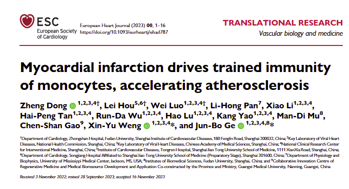 12月12日,復(fù)旦大學(xué)附屬中山醫(yī)院葛均波院士團(tuán)隊(duì)在European Heart Journal期刊(IF=39.3)在線發(fā)表了題為“Myocardial infarction drives trained immunity of monocytes, accelerating atherosclerosis”的研究論文。這項(xiàng)最新研究揭示了心肌缺血如何觸發(fā)造血干細(xì)胞或單核細(xì)胞中的一種免疫訓(xùn)練狀態(tài),從而加速心肌缺血后動(dòng)脈粥樣硬化的發(fā)展。