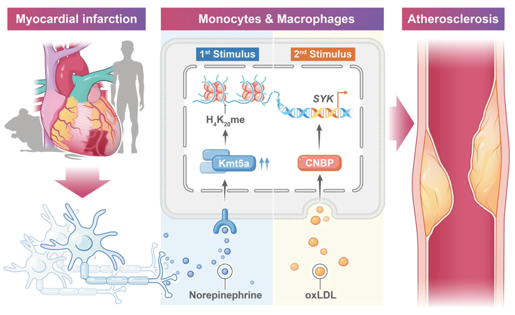 在12月發(fā)表的這項(xiàng)最新研究中,葛均波院士團(tuán)隊(duì)發(fā)現(xiàn)心肌缺血激活了交感神經(jīng)系統(tǒng),期間去甲腎上腺素釋放引起的單核細(xì)胞的KMT5A表達(dá)增加,促進(jìn)了動(dòng)脈粥樣硬化的進(jìn)展。此外,高脂飲食增加了CNBP的表達(dá),誘導(dǎo)了單核細(xì)胞的SYK的產(chǎn)生,進(jìn)一步促進(jìn)血管炎癥和動(dòng)脈粥樣硬化的進(jìn)展。通過(guò)使用小干擾RNA技術(shù)抑制KMT5A或CNBP,以及利用6羥基多巴胺(6-OHDA)抑制外周交感神經(jīng),可以減緩實(shí)驗(yàn)性心肌梗死后的加速動(dòng)脈粥樣硬化進(jìn)展。