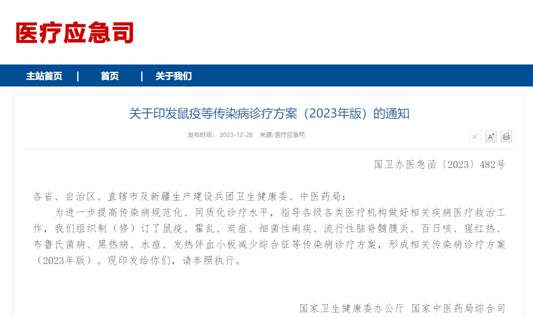 近日,國家衛(wèi)健委發(fā)布鼠疫等傳染病診療方案2023版的通知,制(修)訂了鼠疫、霍亂、炭疽、細(xì)菌性痢疾、流行性腦脊髓膜炎、百日咳、猩紅熱、布魯氏菌病、黑熱病、水痘、發(fā)熱伴血小板減少綜合征等傳染病診療方案,形成相關(guān)傳染病診療方案(2023年版)
