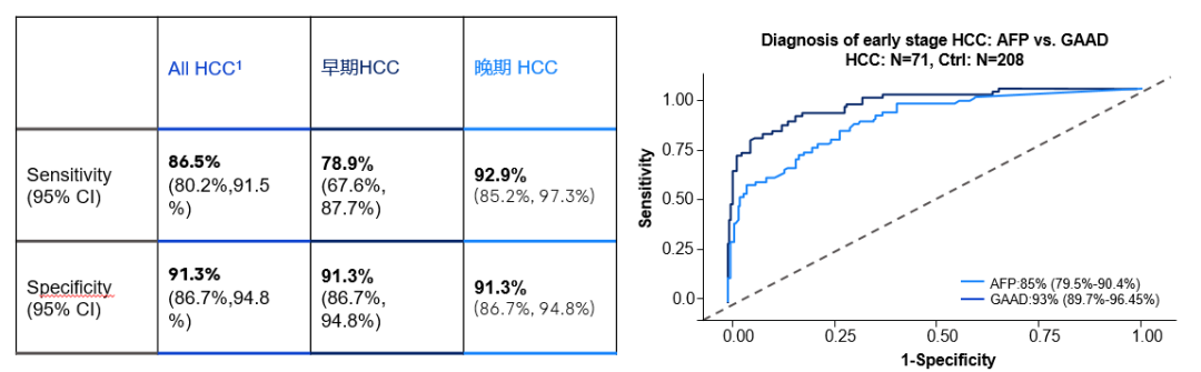 在聯(lián)合檢測(cè)的基礎(chǔ)上,搭載數(shù)字化算法GAAD,可進(jìn)一步提升檢測(cè)性能和效益,為患者全病程管理提供有力支持。在截?cái)嘀禐?.57時(shí), GAAD在檢測(cè)早期 HCC 方面顯示出高特異性和良好的敏感性,GAAD 在早期和全階段監(jiān)HCC方面優(yōu)于 AFP。