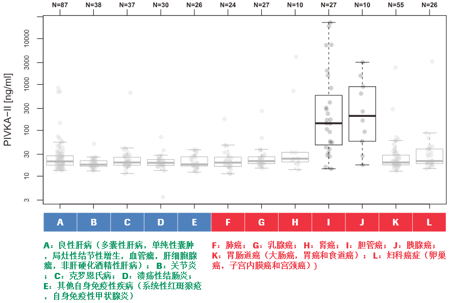 研究者同時(shí)還發(fā)現(xiàn)不同病因?qū)е碌腍CC,PIVKA-II檢測(cè)結(jié)果值數(shù)據(jù)存在顯著性差異性。對(duì)照組無(wú)肝癌,HCC組有肝癌,通過(guò)PIVKA-II的濃度可以清晰區(qū)分對(duì)照組和HCC患者。在患有良性肝病、免疫疾病或非HCC惡性腫瘤的患者中,沒有觀察到升高的PIVKA-II水平(>1000 ng/mL),通過(guò)PIVKA-II測(cè)量得到結(jié)果升高的患者,主要在肝癌中,而在8例膽管癌和胰腺癌患者,5例有膽汁淤積性疾病患者中未觀察到PIVKA-II水平升高。