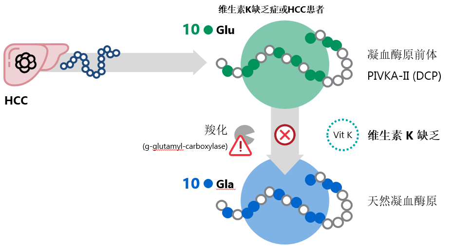 PIVKA-II是指由于維生素K缺乏或拮抗劑-II誘導(dǎo)的蛋白質(zhì)(又稱去甲羥基凝血酶[DCP]),凝血蛋白凝血酶的前體和異常形式,與肝癌的發(fā)生、發(fā)展、浸潤(rùn)和轉(zhuǎn)移密切相關(guān)。當(dāng)一個(gè)或多個(gè)Gla殘基沒有維生素K或存在抑制維生素K依賴性羧化酶活性的拮抗劑的情況下沒有完全羧化為γ-羧基谷氨酸時(shí),就會(huì)產(chǎn)生PIVKA-II并喪失凝血活性。在HCC中,PIVKA-II的產(chǎn)生是由于獲得性的翻譯后羧化缺陷存在22,23。