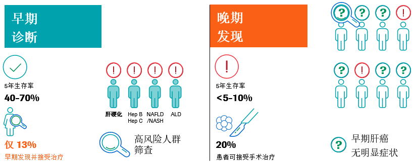 HCC早期多“無(wú)癥狀 ”,所以對(duì)高危人群進(jìn)行監(jiān)測(cè),以便于早發(fā)現(xiàn)、早診斷和早治療。如果在癥狀出現(xiàn)后被診斷,其中大約只有20%的患者在診斷時(shí)符合切除標(biāo)準(zhǔn),5年生存率小于5%-10%。只有約13%的患者被早期診斷和早期治療,早期診斷可將5年生存率提高到40%-70%9-11。