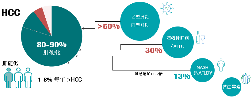 肝細(xì)胞癌(HCC)是肝臟的原發(fā)性惡性腫瘤,是原發(fā)性肝癌的最常見形式(90%),占所有癌癥的7%。95%以上的HCC在慢性肝病的背景下發(fā)展,80%-90%的HCC來(lái)自潛在的肝硬化,三分之一的肝硬化患者會(huì)以每年1–8%的速度發(fā)展成HCC。慢性肝損傷和肝臟炎癥會(huì)導(dǎo)致肝硬化的形成,其中乙型肝炎和丙型肝炎占肝硬化50%以上,酒精性肝病(ALD)占肝硬化的30%以上,肥胖和糖尿病患者的HCC風(fēng)險(xiǎn)比一般人群高1.5–2倍,它們通過(guò)導(dǎo)致肝臟炎性病變、瘢痕組織的形成,進(jìn)一步發(fā)展出現(xiàn)肝纖維化和肝硬化等情況1-5。
