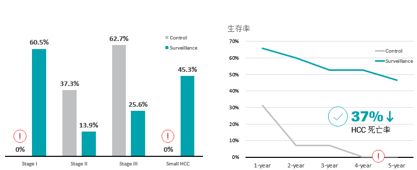 HCC的監(jiān)測(cè)經(jīng)證實(shí)對(duì)生存率有積極影響,可以有效降低患者死亡率。該研究納入了18816名年齡在35-59歲之間、患有HBV感染或有慢性肝炎病史的患者。參與者被隨機(jī)分配到監(jiān)測(cè)組(9373)或?qū)φ战M(9443)。對(duì)照組沒有接受監(jiān)測(cè),繼續(xù)使用衛(wèi)生保健設(shè)施。監(jiān)測(cè)組每 6個(gè)月進(jìn)行一次 AFP 測(cè)試和超聲檢查,對(duì)照組中沒有患者存活超過(guò)5年,與對(duì)照組相比,監(jiān)測(cè)組患者有明顯的生存優(yōu)勢(shì)。研究結(jié)果表明,每半年篩查一次可將HCC死亡率降低37%16。