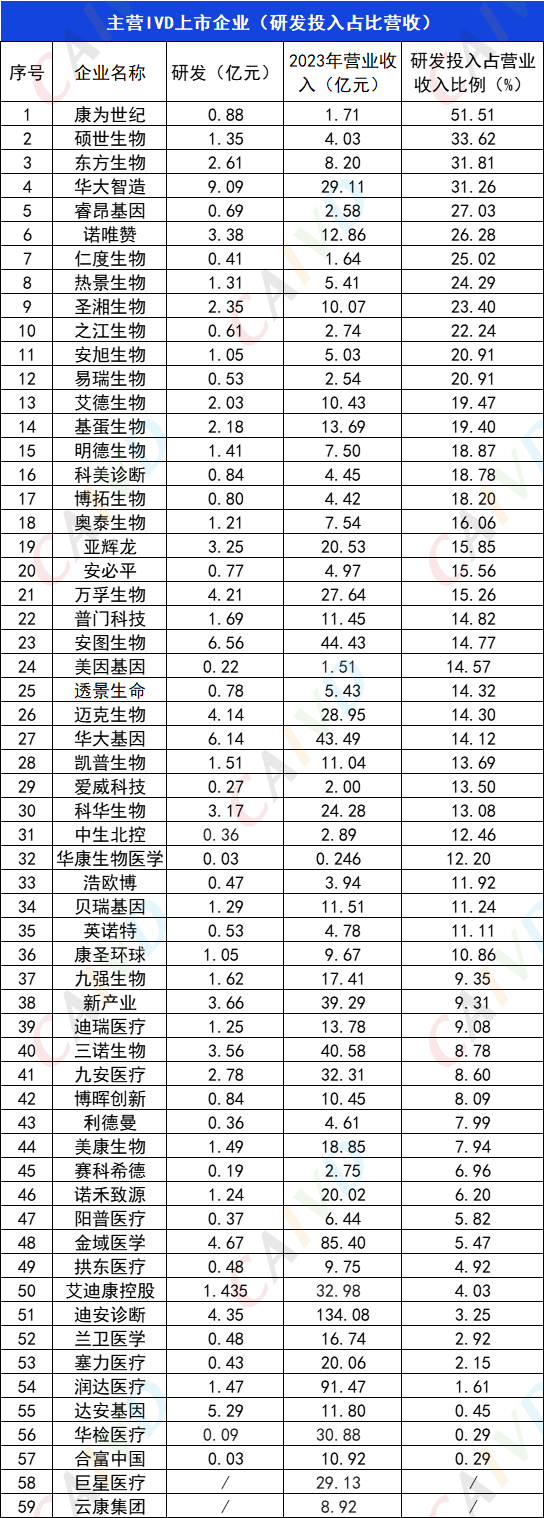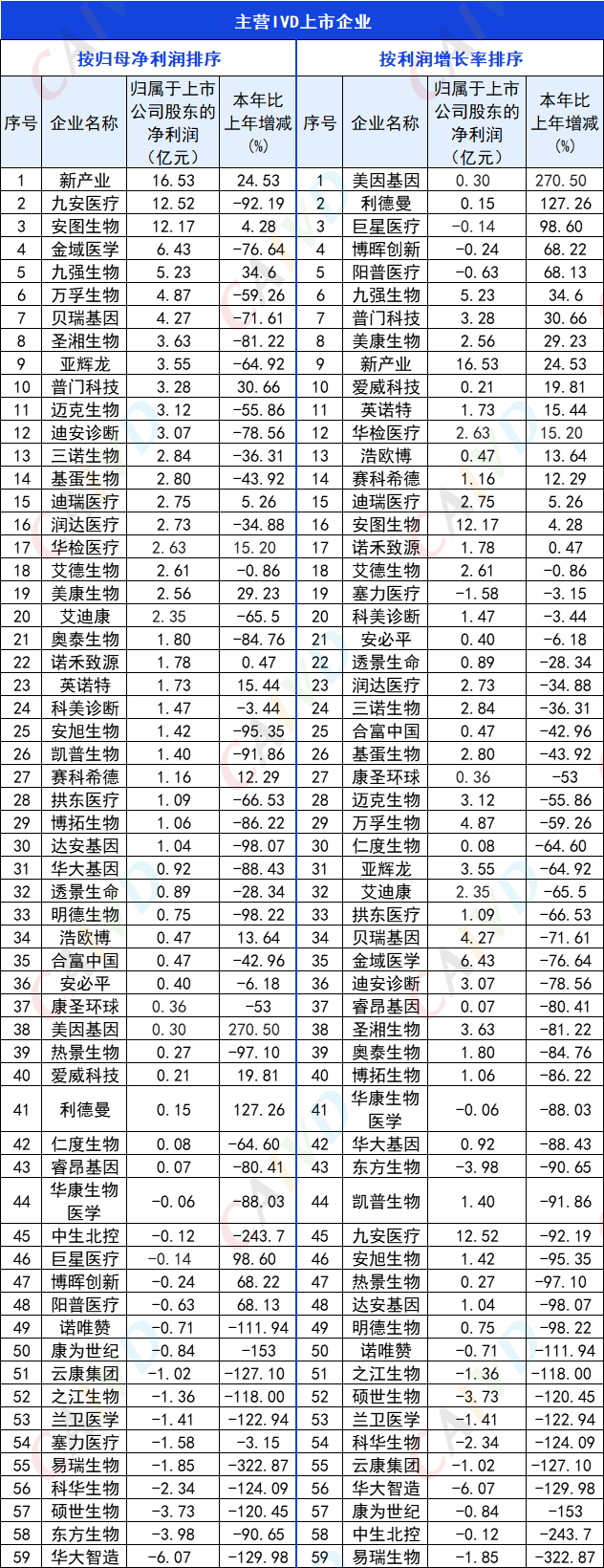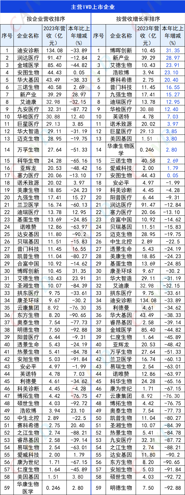 已披露年報(bào)的59家主營(yíng)IVD企業(yè)2023年總營(yíng)收達(dá)1084.43億,相較于2022年的2319.95億減少了53.26%。歸母凈利潤(rùn)91.39億,比2022年同期的591.2億減少了84.54%。營(yíng)收排名前三位的分別為迪安診斷134.08億,潤(rùn)達(dá)醫(yī)療91.47億,金域醫(yī)學(xué)85.4億,但是其與2022年同期相比均有下降。59家企業(yè)中只有17家企業(yè)營(yíng)收較2022年有所增加。據(jù)企業(yè)年報(bào)中顯示 ,2023 年度,伴隨著全球新冠的快速消退,整個(gè)IVD行業(yè)市場(chǎng)規(guī)模快速回落到傳統(tǒng)的非新冠IVD(常規(guī)檢測(cè))業(yè)務(wù)中,主要受新冠IVD檢測(cè)規(guī)模大幅度下降的影響,導(dǎo)致多數(shù)企業(yè)2023年?duì)I收出現(xiàn)一定幅度的下降。