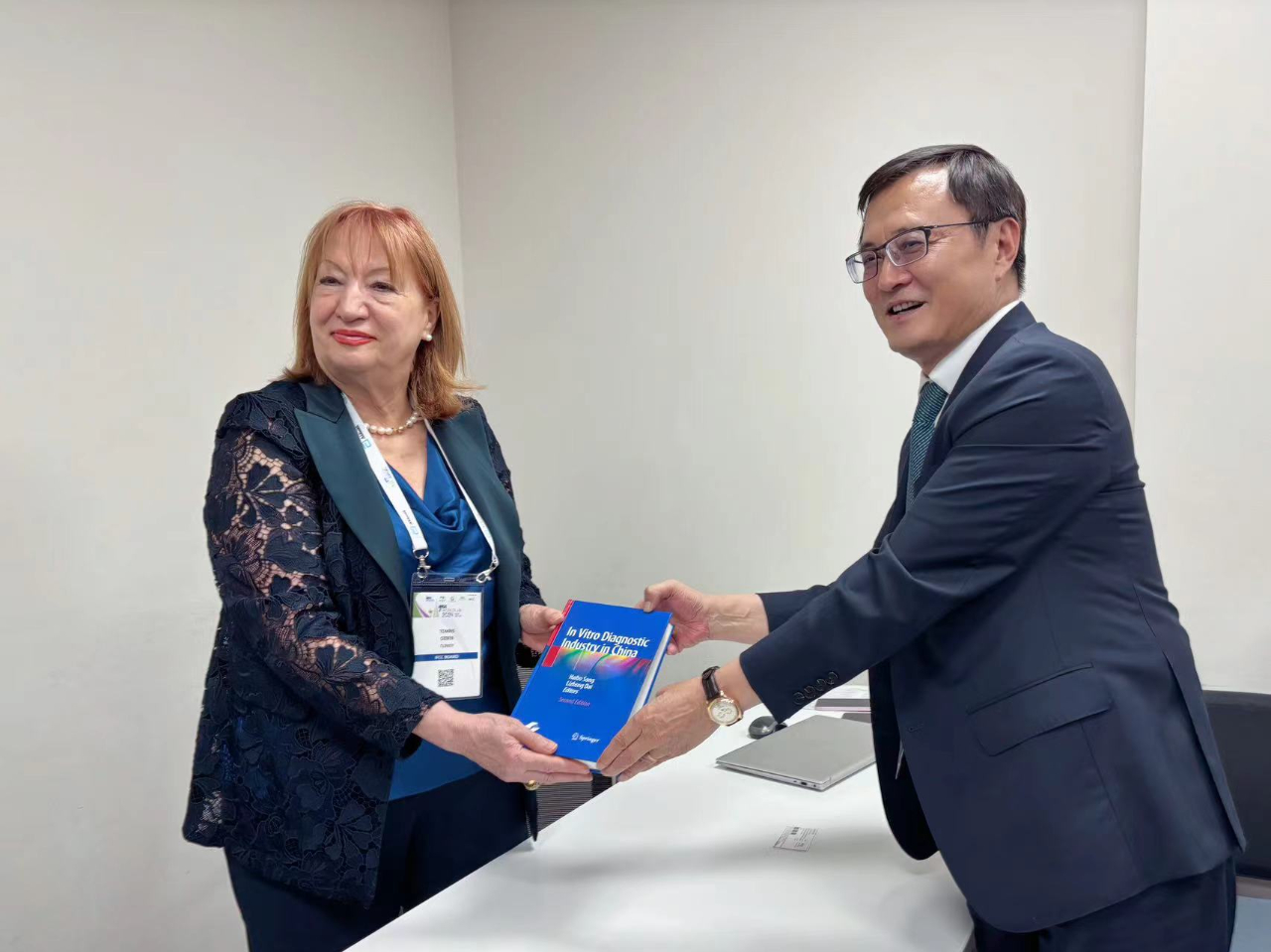 宋海波教授向Tomris Ozben教授贈(zèng)出《中國體外診斷產(chǎn)業(yè)發(fā)展藍(lán)皮書》英文版第二卷