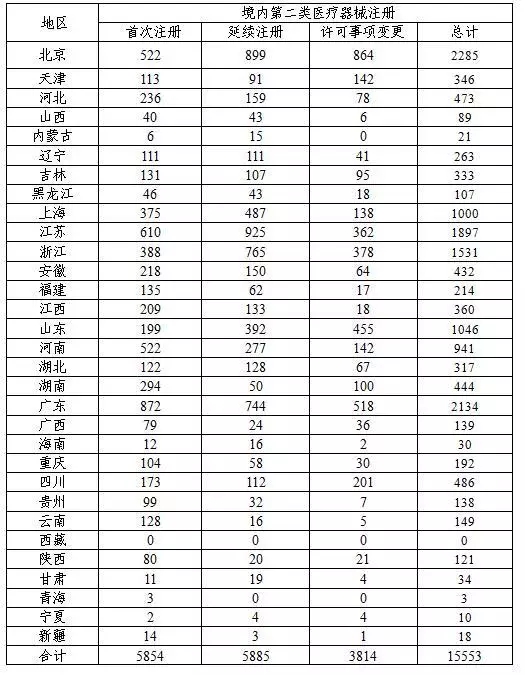 2016年,各省級(jí)食品藥品監(jiān)管部門(mén)共批準(zhǔn)境內(nèi)第二類醫(yī)療器械注冊(cè)15553項(xiàng),與2015年相比增長(zhǎng)26.4%。其中首次注冊(cè)5854項(xiàng),延續(xù)注冊(cè)5885項(xiàng),許可事項(xiàng)變更注冊(cè)3814項(xiàng)。