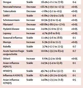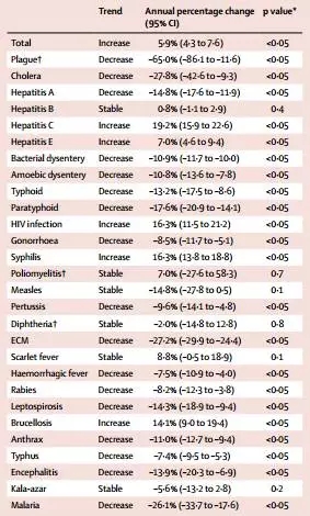 在45種傳染病中,2004-2013年間發(fā)病率升高的有10種,下降的有20種,11種保持不變,4種為新出現(xiàn)的疾病。十年研究中記錄到的三分之二病例(66%)是由手足口病、乙型肝炎和結(jié)核病引起的,這是三種最常見的傳染病。增長最快的傳染病是包蟲病、丙型肝炎、梅毒和HIV感染(2004-2013年每年分別增長24%、19.2%、16.3%和16.3%),死亡率最高的是狂犬病、甲型禽流感H5N1和鼠疫。