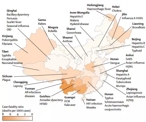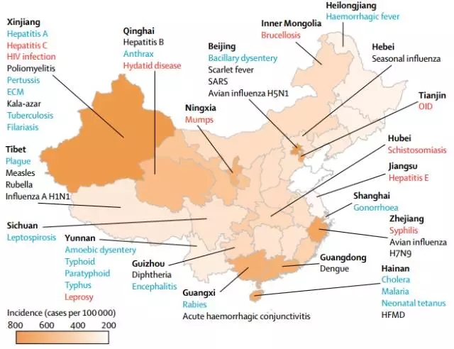 按地域來看,結(jié)果有些令人吃驚。排名第一的居然是經(jīng)濟文化相對最發(fā)達的北京!45種傳染病年總發(fā)病率最高的三個省級地區(qū)為北京(753.45/10萬)、新疆(748.37/10萬)、浙江(689.88/10萬例)。病死率最高的三個省級地區(qū)為云南(7.65/1000)、廣西(6.29/1000)、貴州(4.82/1000)。45種傳染病中,發(fā)病率最高的主要分布在19個省級地區(qū),死亡率最高的主要分布在23個省級地區(qū)。