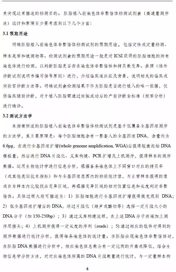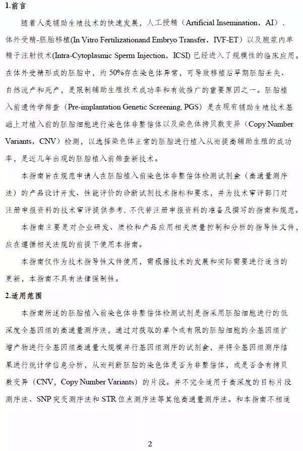 2017年3月15日,中國食品藥品檢定研究院官網發(fā)布了《胚胎植入前染色體非整倍體檢測試劑的質量控制技術評價指南(高通量測序法)》(以下簡稱《指南》), 旨在規(guī)范申請人在胚胎植入前染色體非整倍體檢測試劑盒(高通量測序法)的產品設計開發(fā)、性能評價的診斷試劑技術指標和要求,并為技術審評部門對注冊申報資料的技術審評提供參考。