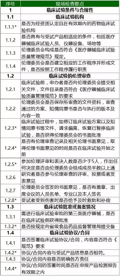 (二)2016年6月1日后開展臨床試驗的醫(yī)療器械產(chǎn)品(不含體外診斷試劑)按照《醫(yī)療器械臨床試驗質(zhì)量管理規(guī)范》(總局令第25號)的原則及要求開展監(jiān)督檢查。詳情如下表: