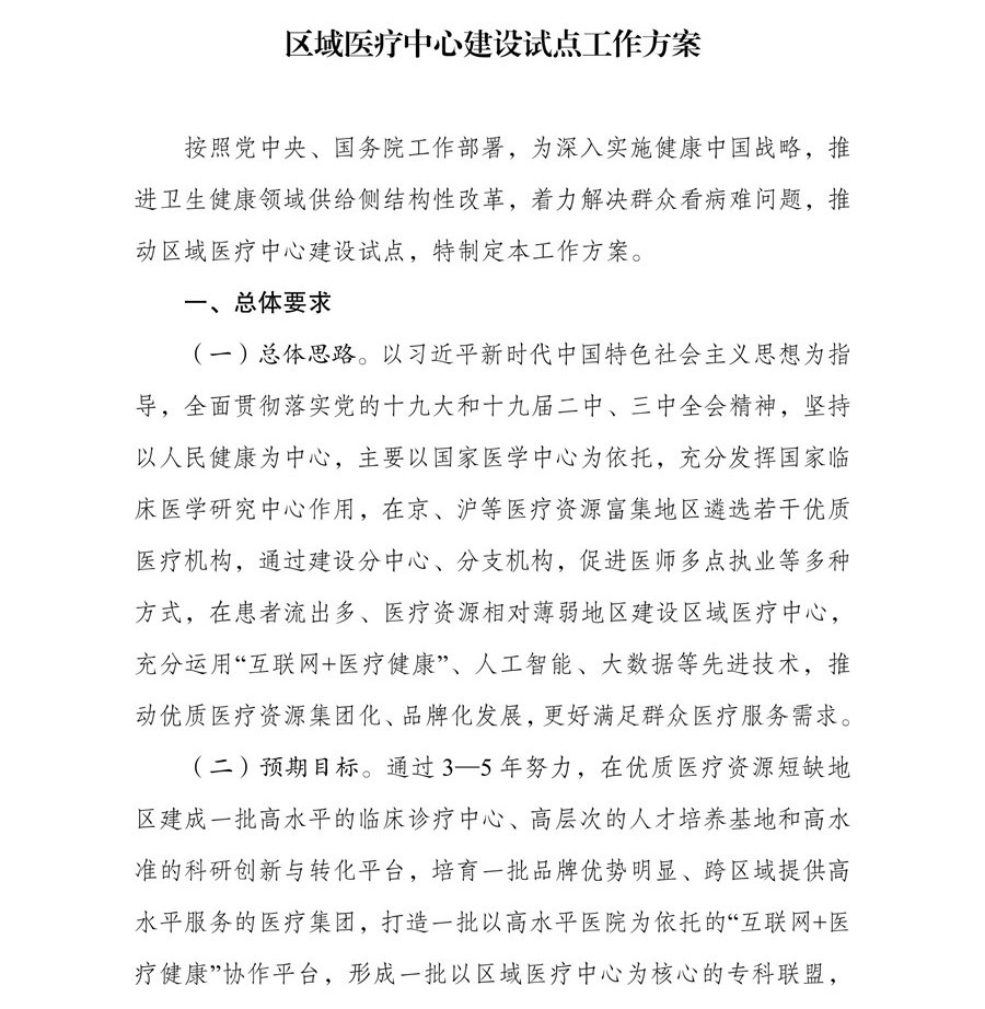 近日,國家發(fā)展改革委、國家衛(wèi)生健康委、國家中醫(yī)藥局、國務院醫(yī)改領導小組秘書處4部門聯(lián)合發(fā)布了《區(qū)域醫(yī)療中心建設試點工作方案》(以下簡稱《方案》)。