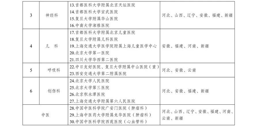 30家試點輸出醫(yī)院主要從北京、上海兩地選取,少量從武漢、長沙、廣州、成都、西安 5個優(yōu)質醫(yī)療資源集中地方選取,除北京、上海兩地有部分市屬醫(yī)院外,其余均為國家衛(wèi)生健康委、國家中醫(yī)藥局和教育部直屬高校所管醫(yī)院。(文末附名單)