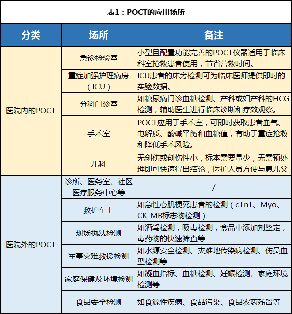 同時(shí)POCT的應(yīng)用場所也在發(fā)生變化,從之前醫(yī)院的檢驗(yàn)科發(fā)展到各科室的檢測使用,伴著分級(jí)診療在基層鄉(xiāng)鎮(zhèn)衛(wèi)生院和社區(qū)門診逐步被推廣,相較于傳統(tǒng)的臨床檢測,POCT具有即時(shí)便捷的優(yōu)點(diǎn),樣本處理時(shí)間更短,采樣現(xiàn)場分析更快,在靈活性與時(shí)效性方面與傳統(tǒng)檢驗(yàn)互補(bǔ),彌補(bǔ)了基層醫(yī)院檢驗(yàn)資源的不足。POCT不僅出現(xiàn)在個(gè)人的健康醫(yī)療生活中(如常見的排卵試紙、血壓計(jì)、血糖計(jì)等),還廣泛應(yīng)用于各行各業(yè)。2009年2月,胡錦濤主席發(fā)出了《中華人民共和國食品安全法》的主席令,相繼國務(wù)院辦公廳、衛(wèi)生部也就加強(qiáng)食品安全整頓及監(jiān)測工作發(fā)出了通知,要求加強(qiáng)食品安全隱患應(yīng)急檢驗(yàn),對(duì)導(dǎo)致食品安全事故的食品及其原料應(yīng)立即檢驗(yàn)。食品檢測的高標(biāo)準(zhǔn)與嚴(yán)把控成為執(zhí)法人員的首要責(zé)任,也成為POCT市場開發(fā)的新渠道。災(zāi)難救援疫情控制場所對(duì)POCT產(chǎn)品提出了更高的要求:小巧輕便外形堅(jiān)固,操作便捷精準(zhǔn),檢驗(yàn)報(bào)告可以遠(yuǎn)程發(fā)送等,這些不同行業(yè)的應(yīng)用環(huán)境給POCT發(fā)展開辟了新的思路。(具體見表1)