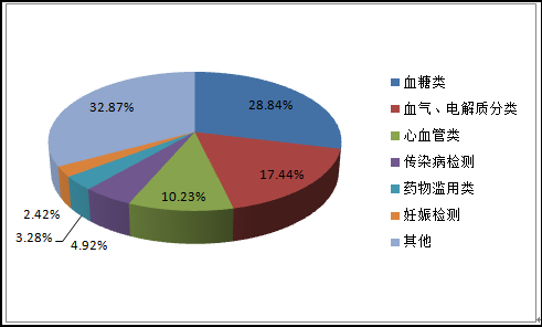 13大項(xiàng)目:主要集中在血糖檢測、血?dú)夂碗娊赓|(zhì)分析、快速血凝檢測、心臟標(biāo)志物快速診斷、藥物濫用篩檢、尿液分析、干式生化檢測、懷孕測試、糞便潛血血液分析、食品病原體篩查、血紅蛋白檢測、傳染病檢測、甘油三酯和膽固醇等血脂項(xiàng)目的檢測。
