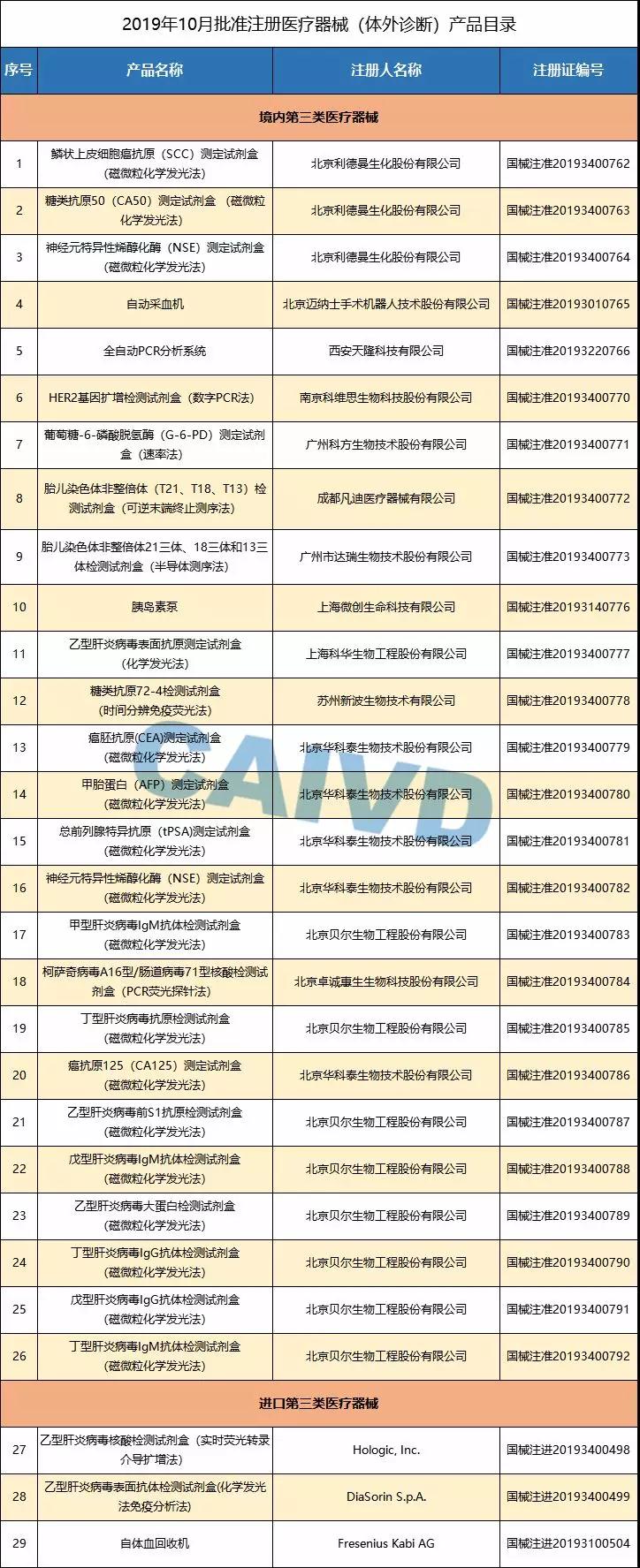 2019年10月,國(guó)家藥品監(jiān)督管理局共批準(zhǔn)注冊(cè)醫(yī)療器械產(chǎn)品43個(gè)。其中,體外診斷產(chǎn)品共29個(gè),境內(nèi)第三類體外診斷產(chǎn)品26個(gè),進(jìn)口第三類體外診斷產(chǎn)品3個(gè)(具體產(chǎn)品見下圖)。