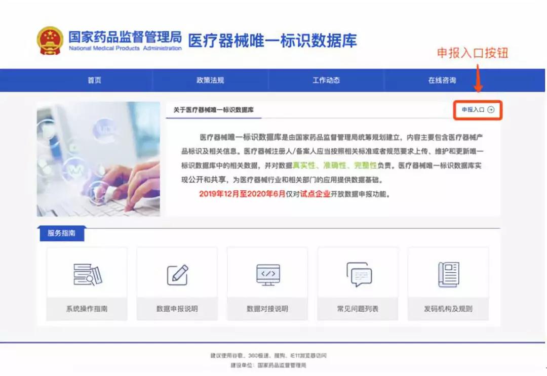 醫(yī)療器械唯一標(biāo)識數(shù)據(jù)庫是醫(yī)療器械唯一標(biāo)識系統(tǒng)的重要組成部分。按照《醫(yī)療器械唯一標(biāo)識系統(tǒng)規(guī)則》的要求和《醫(yī)療器械唯一標(biāo)識系統(tǒng)試點工作方案》的安排,醫(yī)療器械唯一標(biāo)識數(shù)據(jù)庫于2019年12月10日正式上線,面向試點企業(yè)開放針對試點品種的唯一標(biāo)識相關(guān)數(shù)據(jù)申報功能。