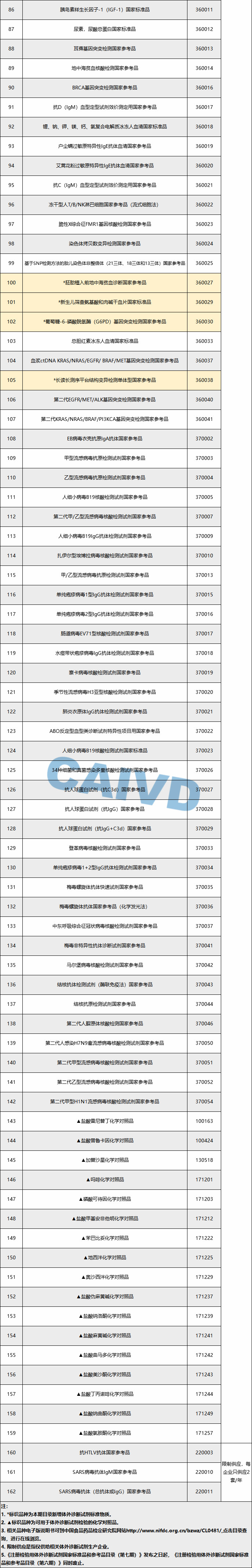 近日,中檢院發(fā)布關(guān)于第七期注冊(cè)檢驗(yàn)用體外診斷試劑國(guó)家標(biāo)準(zhǔn)品和參考品目錄的通知。在注冊(cè)檢驗(yàn)用體外診斷試劑國(guó)家標(biāo)準(zhǔn)品和參考品目錄(第六期)的基礎(chǔ)上,新增4個(gè)品種,現(xiàn)將162個(gè)品種公布如下:
