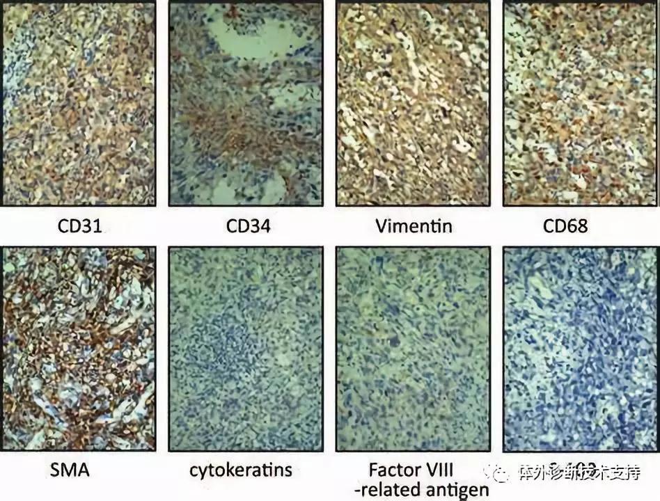 對于來源不明的轉(zhuǎn)移瘤,用免疫組化技術(shù)有助于確定惡性腫瘤的組織學(xué)來源,進(jìn)一步確定原發(fā)部位。如角蛋白抗體(CK20)在胃腸道癌、膽管癌、胰腺癌中陽性,而在肺癌、乳腺癌、腎癌中陰性;Tg陽性可考慮甲狀腺轉(zhuǎn)移;波形蛋白(Vimentin)陽性支持肉瘤的診斷;前列腺特異性抗原(PAS)陽性可考慮前列腺轉(zhuǎn)移;甲狀腺球蛋白陽性可考慮甲狀腺濾泡細(xì)胞癌;肌動蛋白(Actin)、肌球蛋白(Myosin)、結(jié)蛋白(Desmin)、肌紅蛋白(Myoglobin)陽性可考慮橫紋肌肉瘤;S-100蛋白陽性支持黑色素瘤的診斷;等等這些都為腫瘤的治療及預(yù)后提供了依據(jù)。