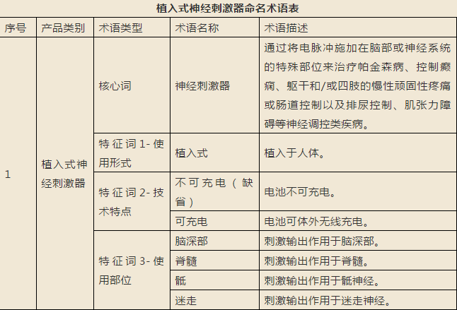 以有源植入器械領域中植入式神經(jīng)刺激器產(chǎn)品為例,可參考以下格式和內容形成命名術語表: