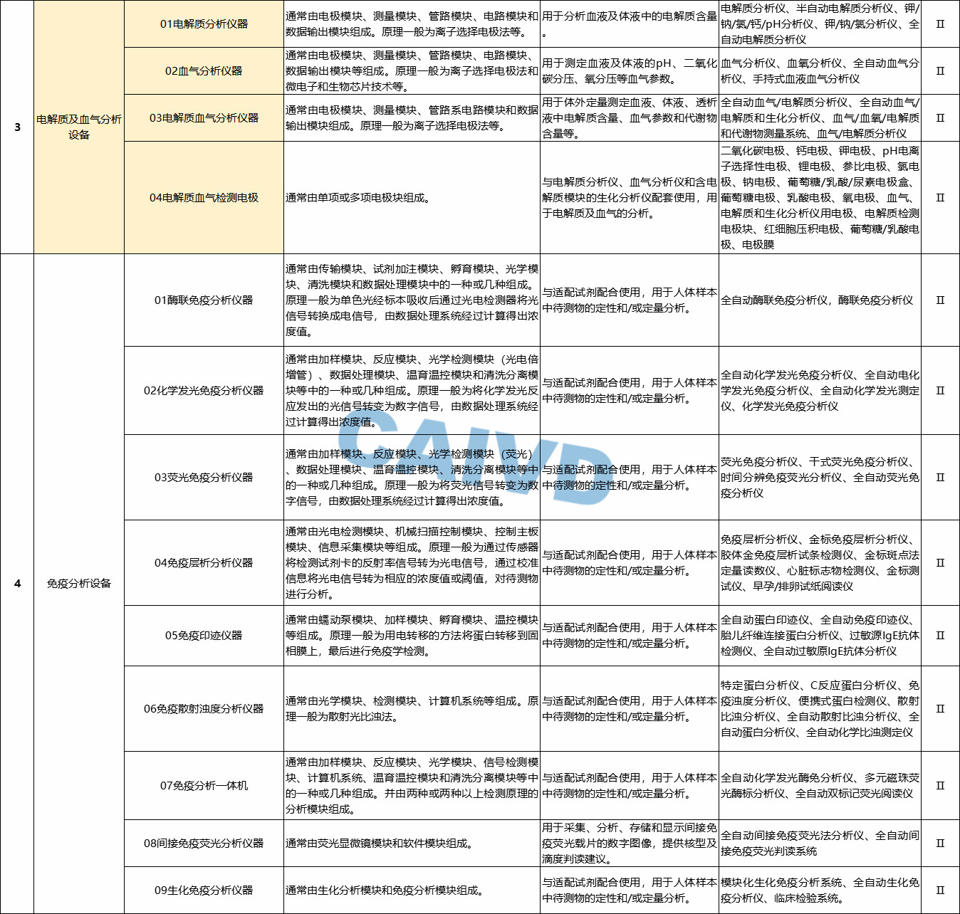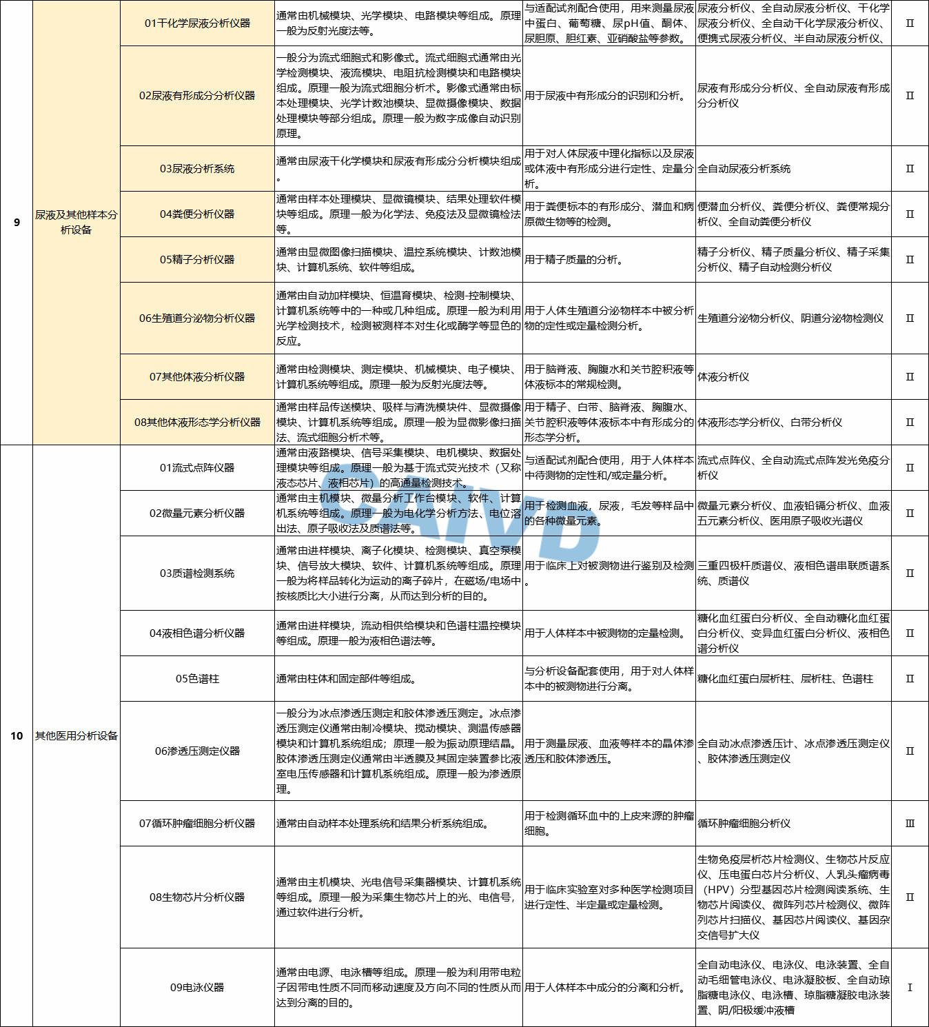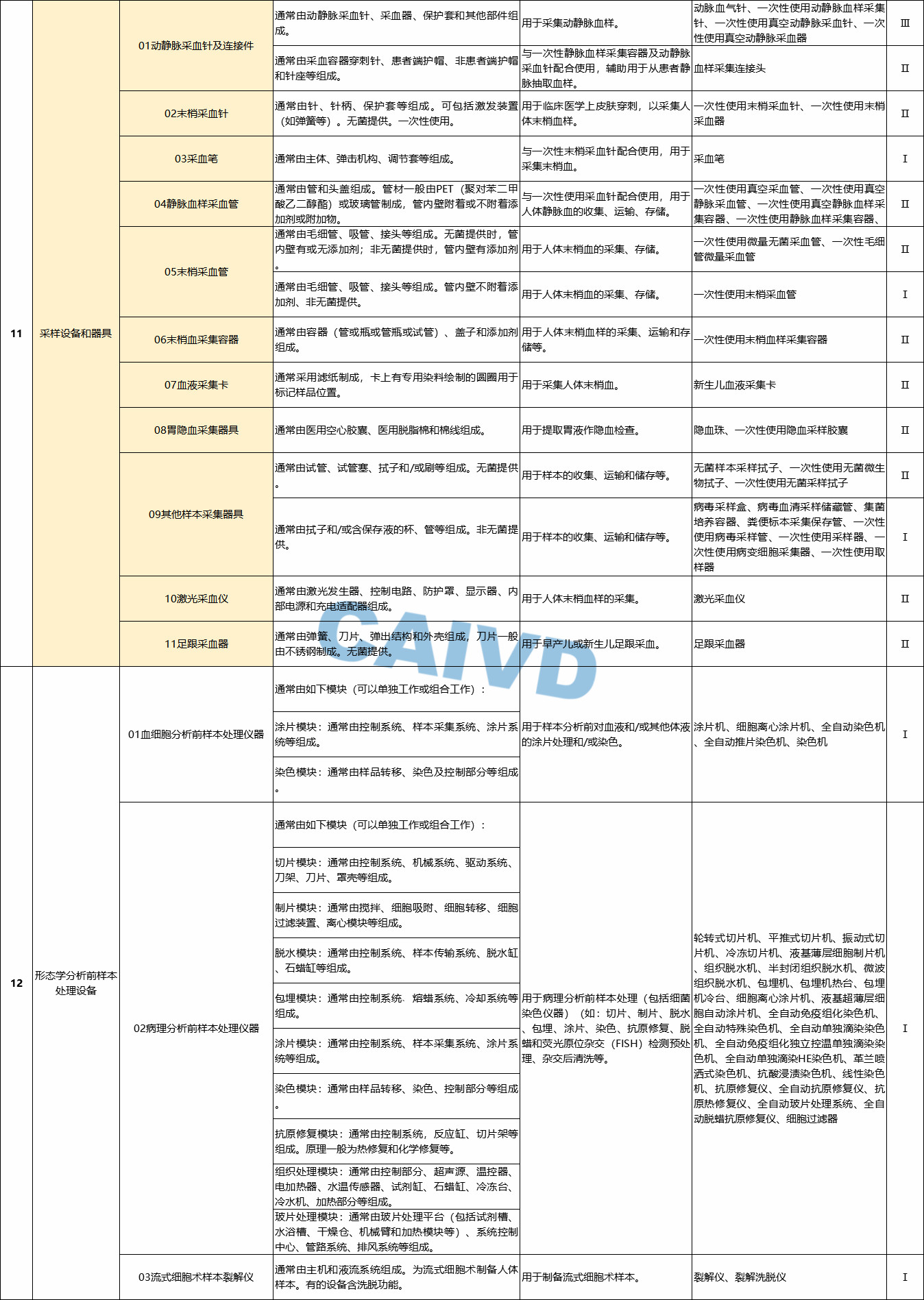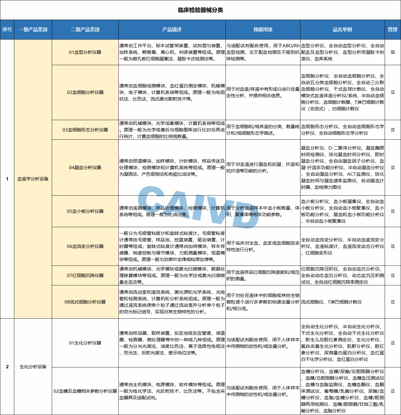 本目錄包括用于臨床檢驗實驗室的設備、儀器、輔助設備和器具及醫(yī)用低溫存貯設備,不包括體外診斷試劑。本目錄主要以檢驗學科和設備性能為依據,分為16個一級產品類別,其中,臨床檢驗分析設備10個,采樣設備1個,樣本處理設備3個,檢驗及其他輔助設備和醫(yī)用生物防護設備各1個。按照學科內儀器類別細分為86個二級產品類別,列出411個品名舉例。詳細如下: