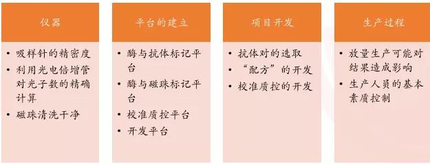 根本原因在于被測物(抗原、抗體)在樣本中的濃度低,造成從研發(fā)、生產(chǎn)到使用需要更加精密、規(guī)范——生化診斷測試的糖類,脂肪類等在人體內(nèi)的含量普遍為g/L-μg/L水平,而免疫診斷的對象抗原、抗體等僅為μg/L—pg/L水平,兩者差別達(dá)到約106倍。