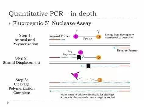 由于雙鏈摻入法存在特異性較低的問題,1996 年Heid綜合之前發(fā)現(xiàn)的Taq 酶的5'核酸酶活性與熒光共振能量轉(zhuǎn)移( fluorescence resonance energytransfer,F(xiàn)RET) 探針的概念提出了使用Taqman 探針進行qPCR 的方法。TaqMan 探針的本質(zhì)是FRET 寡核苷酸探針,在探針的5'端標(biāo)記熒光報告基團,3'端標(biāo)記熒光淬滅基團,利用Taq 酶具有5' ~ 3'外切酶活性,在PCR過程中水解與靶序列結(jié)合的寡核苷酸探針,使熒光基團得以游離,釋放熒光信號。從而使能夠與靶序列雜交的探針在擴增過程中釋放熒光,通過real-time PCR 的原理對其進行定量。由于其超高的特異性與成功的商品化推廣,Taqman 探針已經(jīng)成為目前臨床使用最為廣泛的qPCR 方法,其在各種病毒基因定量檢測、基因分型、腫瘤相關(guān)基因表達檢測等方面具有著不可替代的地位。