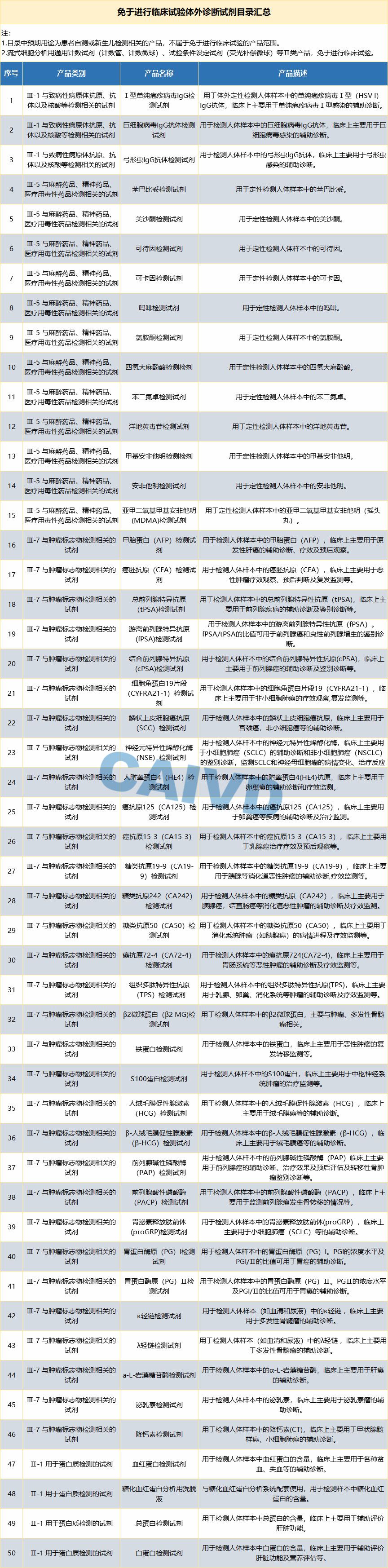 時(shí)至今日,免于進(jìn)行臨床試驗(yàn)醫(yī)療器械產(chǎn)品涵蓋1003項(xiàng),其中體外診斷儀器產(chǎn)品達(dá)54項(xiàng);體外診斷試劑產(chǎn)品共416項(xiàng)。詳細(xì)信息如下: