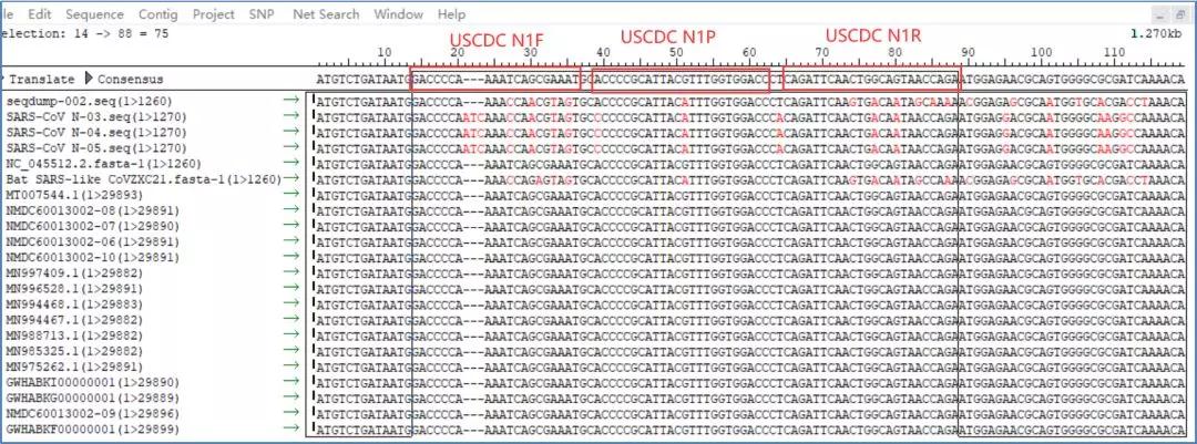 用SARS和蝙蝠CoV的N基因序列作為對照,對新型冠狀病毒的N基因序列排序,從圖1、2、3中可見,在美國CDC的設計中,除了第二套的上游引物不特異外,其余探針和引物的位置都是選擇了組內(nèi)保守組間特異的區(qū)域。第二套的探針和下游引物都是在特異的區(qū)域,所以也不會產(chǎn)生非特異的擴增。