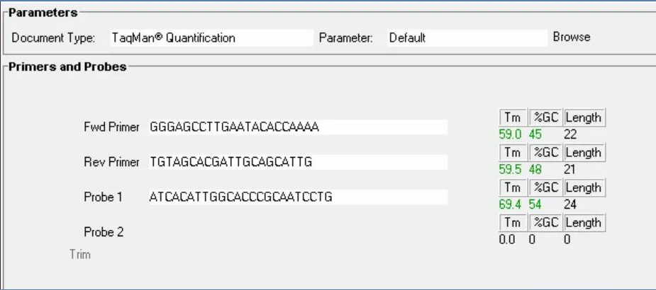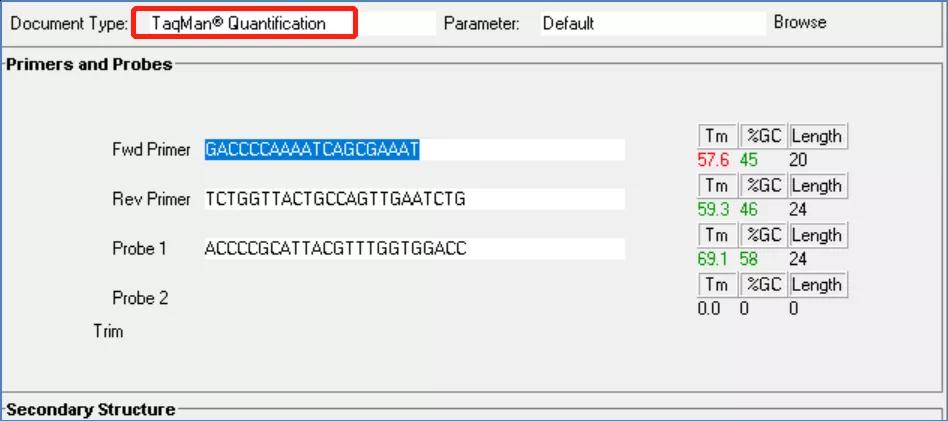 Taqman探針法熒光PCR通常采用二步法,即在94℃左右變性,60℃退火和延伸。所以,通常引物的Tm值設計在60±2℃,探針在70±2℃。