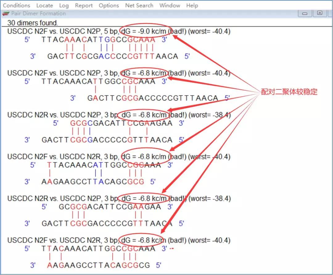 設計時通常將二聚體(自身二聚體或配對二聚體)控制在dG>-5.0kc/m, 最好dG>-3.6 kc/m。從圖8顯示的三套引物探針的自身二聚體可見,第二套的探針具有一個非常穩(wěn)定的自身二聚體(dG=-13.1kc/m),第二套的上游引物N2F有一個穩(wěn)定的自身二聚體(dG=-9.3kc/m),第三套下游引物具有一個比較穩(wěn)定的自身二聚體(dG=-7.0kc/m)。