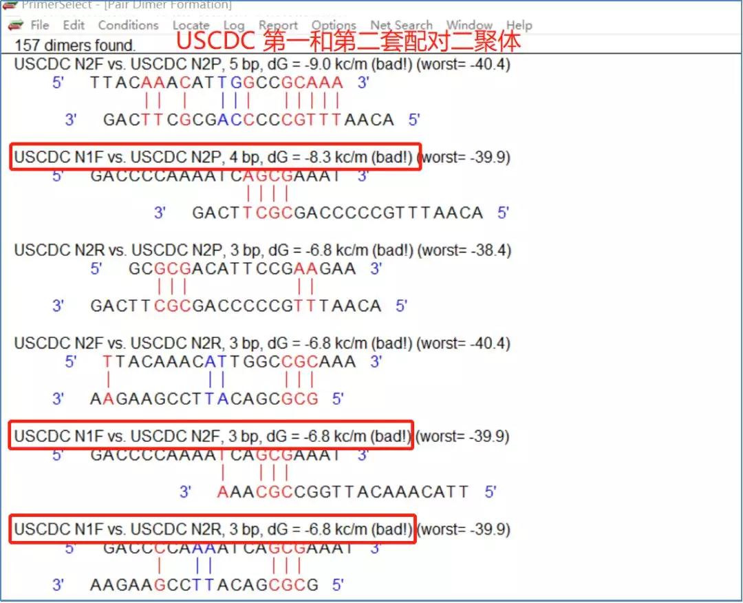 7) 引物探針的配對二聚體穩(wěn)定(中國CDC的N基因、美國N基因第二和第三套、德國的E基因)。